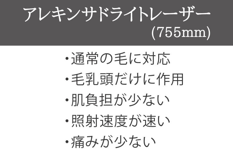 2つの波長を使い分けることで一人ひとりのお肌や毛の状態に合わせた脱毛が可能です。