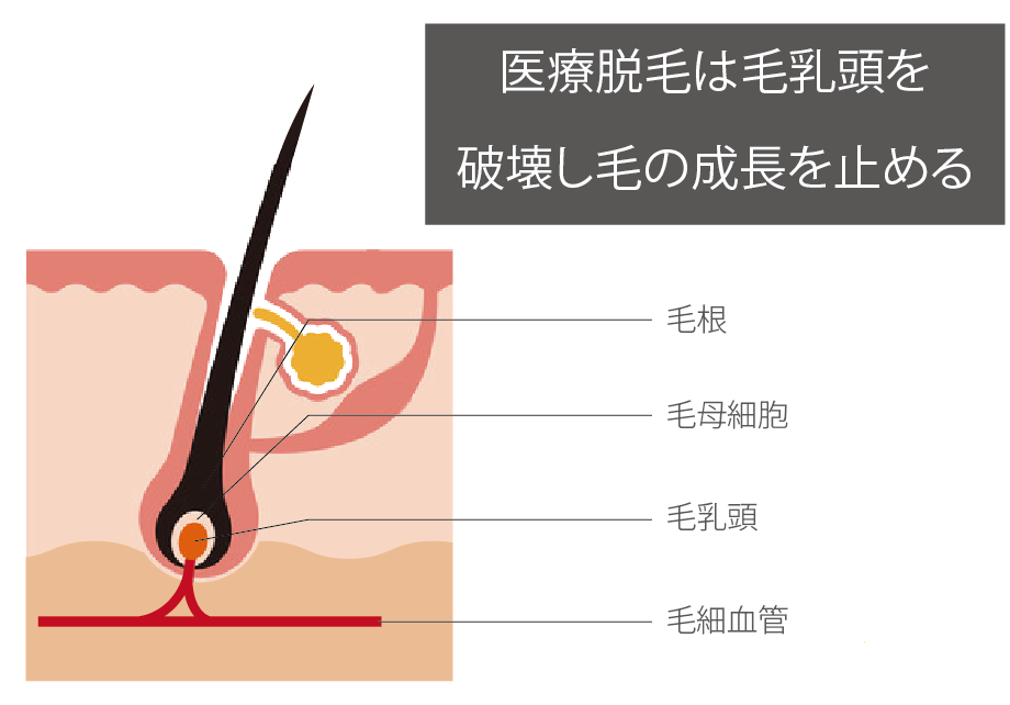 エステサロンで毛乳頭を破壊する行為は医師法違反になるため、光脱毛では毛乳頭や毛根にダメージを与えることしかできません。