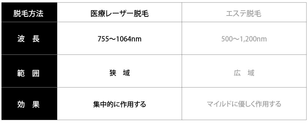 医療レーザー脱毛とエステ脱毛(光・フラッシュ脱毛)では脱毛機から照射されるレーザーの波長が異なります。